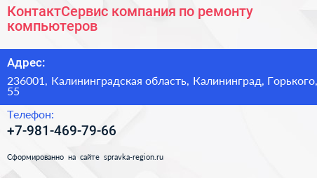 КонтактСервис, компания по ремонту компьютеров по адресу 236001, Калининградская область, Калининград, Горького, 55 в дальнейшем Организация, размещена в следующих категориях:
