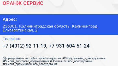 ОРАНЖ СЕРВИС по адресу 236001, Калининградская область, Калининград, Елизаветинская, 2 в дальнейшем Организация, размещена в следующих категориях:
