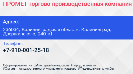 ПРОМЕТ, торгово-производственная компания по адресу 236034, Калининградская область, Калининград, Дзержинского, 240 к1 в дальнейшем Организация, размещена в следующих категориях: