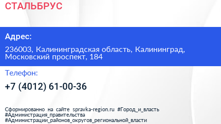 СТАЛЬБРУС по адресу 236003, Калининградская область, Калининград, Московский проспект, 184 в дальнейшем Организация, размещена в следующих категориях: