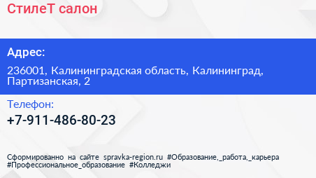 СтилеТ, салон по адресу 236001, Калининградская область, Калининград, Партизанская, 2 в дальнейшем Организация, размещена в следующих категориях: