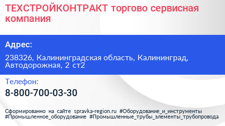 ТЕХСТРОЙКОНТРАКТ, торгово-сервисная компания по адресу 238326, Калининградская область, Калининград, Автодорожная, 2 ст2 в дальнейшем Организация, размещена в следующих категориях: