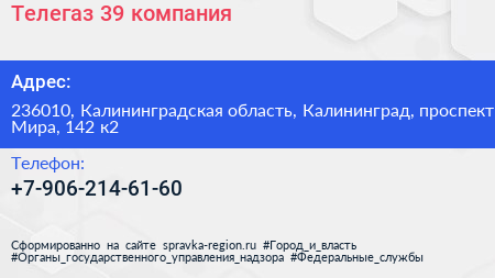 Телегаз-39, компания по адресу 236010, Калининградская область, Калининград, проспект Мира, 142 к2 в дальнейшем Организация, размещена в следующих категориях: