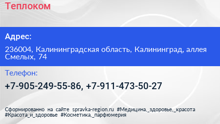 Теплоком по адресу 236004, Калининградская область, Калининград, аллея Смелых, 74 в дальнейшем Организация, размещена в следующих категориях: