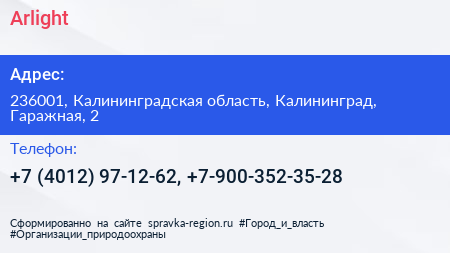 Arlight по адресу 236001, Калининградская область, Калининград, Гаражная, 2 в дальнейшем Организация, размещена в следующих категориях: