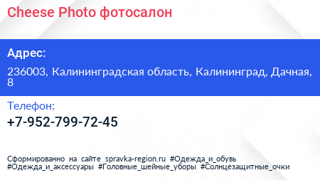 Cheese Photo, фотосалон по адресу 236003, Калининградская область, Калининград, Дачная, 8 в дальнейшем Организация, размещена в следующих категориях: