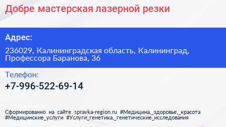 Добре, мастерская лазерной резки по адресу 236029, Калининградская область, Калининград, Профессора Баранова, 36 в дальнейшем Организация, размещена в следующих категориях: