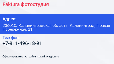 Faktura, фотостудия по адресу 236010, Калининградская область, Калининград, Правая Набережная, 21 в дальнейшем Организация, размещена в следующих категориях: