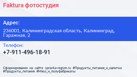 Faktura, фотостудия по адресу 236001, Калининградская область, Калининград, Гаражная, 2 в дальнейшем Организация, размещена в следующих категориях: