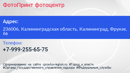 ФотоПринт, фотоцентр по адресу 236006, Калининградская область, Калининград, Фрунзе, 6в в дальнейшем Организация, размещена в следующих категориях: