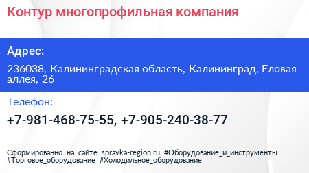 Контур, многопрофильная компания по адресу 236038, Калининградская область, Калининград, Еловая аллея, 26 в дальнейшем Организация, размещена в следующих категориях: