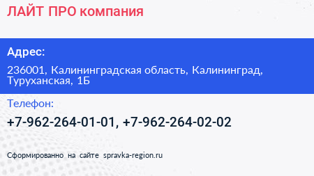 ЛАЙТ-ПРО, компания по адресу 236001, Калининградская область, Калининград, Туруханская, 1Б в дальнейшем Организация, размещена в следующих категориях: