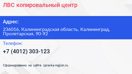 ЛВС, копировальный центр по адресу 236016, Калининградская область, Калининград, Пролетарская, 90-92 в дальнейшем Организация, размещена в следующих категориях: