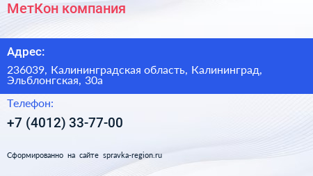 МетКон, компания по адресу 236039, Калининградская область, Калининград, Эльблонгская, 30а в дальнейшем Организация, размещена в следующих категориях: