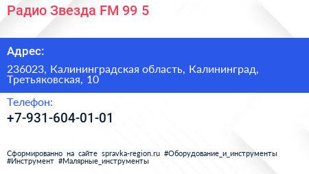 Радио Звезда, FM 99.5 по адресу 236023, Калининградская область, Калининград, Третьяковская, 10 в дальнейшем Организация, размещена в следующих категориях: