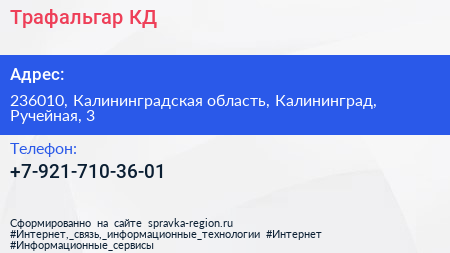 Трафальгар-КД по адресу 236010, Калининградская область, Калининград, Ручейная, 3 в дальнейшем Организация, размещена в следующих категориях: