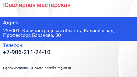 Ювелирная мастерская по адресу 236001, Калининградская область, Калининград, Профессора Баранова, 30 в дальнейшем Организация, размещена в следующих категориях: