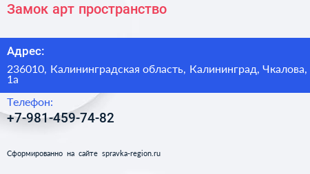 Замок, арт-пространство по адресу 236010, Калининградская область, Калининград, Чкалова, 1а в дальнейшем Организация, размещена в следующих категориях: