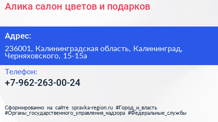 Алика, салон цветов и подарков по адресу 236001, Калининградская область, Калининград, Черняховского, 15-15а в дальнейшем Организация, размещена в следующих категориях: