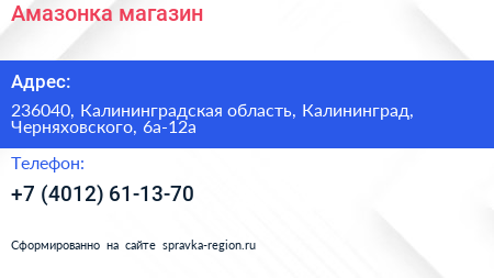 Амазонка, магазин по адресу 236040, Калининградская область, Калининград, Черняховского, 6а-12а в дальнейшем Организация, размещена в следующих категориях: