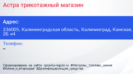 Астра, трикотажный магазин по адресу 236005, Калининградская область, Калининград, Камская, 2Б к4 в дальнейшем Организация, размещена в следующих категориях: