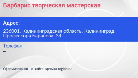 Барбарис, творческая мастерская по адресу 236001, Калининградская область, Калининград, Профессора Баранова, 34 в дальнейшем Организация, размещена в следующих категориях: