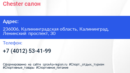 Chester, салон по адресу 236006, Калининградская область, Калининград, Ленинский проспект, 30 в дальнейшем Организация, размещена в следующих категориях: