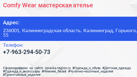 Comfy Wear, мастерская-ателье по адресу 236001, Калининградская область, Калининград, Горького, 55 в дальнейшем Организация, размещена в следующих категориях: