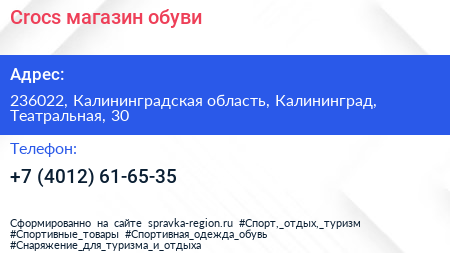 Crocs, магазин обуви по адресу 236022, Калининградская область, Калининград, Театральная, 30 в дальнейшем Организация, размещена в следующих категориях: