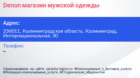 Denon, магазин мужской одежды по адресу 236011, Калининградская область, Калининград, Интернациональная, 30 в дальнейшем Организация, размещена в следующих категориях: