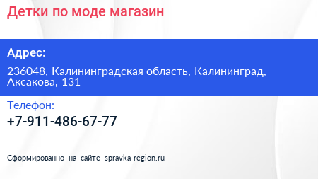 Детки по моде, магазин по адресу 236048, Калининградская область, Калининград, Аксакова, 131 в дальнейшем Организация, размещена в следующих категориях: