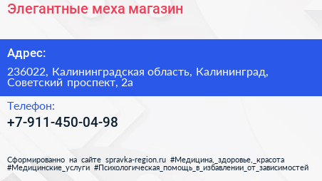 Элегантные меха, магазин по адресу 236022, Калининградская область, Калининград, Советский проспект, 2а в дальнейшем Организация, размещена в следующих категориях: