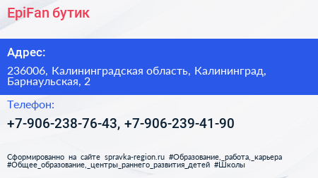 EpiFan, бутик по адресу 236006, Калининградская область, Калининград, Барнаульская, 2 в дальнейшем Организация, размещена в следующих категориях: