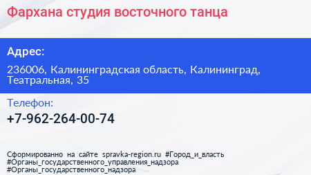 Фархана, студия восточного танца по адресу 236006, Калининградская область, Калининград, Театральная, 35 в дальнейшем Организация, размещена в следующих категориях: