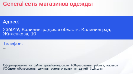 General, сеть магазинов одежды по адресу 236019, Калининградская область, Калининград, Жиленкова, 10 в дальнейшем Организация, размещена в следующих категориях: