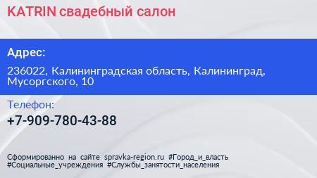 KATRIN, свадебный салон по адресу 236022, Калининградская область, Калининград, Мусоргского, 10 в дальнейшем Организация, размещена в следующих категориях: