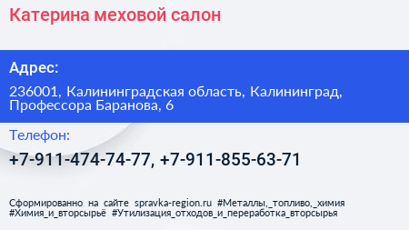 Катерина, меховой салон по адресу 236001, Калининградская область, Калининград, Профессора Баранова, 6 в дальнейшем Организация, размещена в следующих категориях: