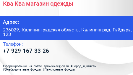 Ква-Ква, магазин одежды по адресу 236029, Калининградская область, Калининград, Гайдара, 123 в дальнейшем Организация, размещена в следующих категориях: