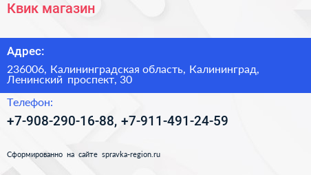 Квик, магазин по адресу 236006, Калининградская область, Калининград, Ленинский проспект, 30 в дальнейшем Организация, размещена в следующих категориях:
