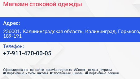 Магазин стоковой одежды по адресу 236001, Калининградская область, Калининград, Горького, 189-191 в дальнейшем Организация, размещена в следующих категориях: