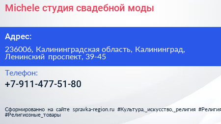 Michele, студия свадебной моды по адресу 236006, Калининградская область, Калининград, Ленинский проспект, 39-45 в дальнейшем Организация, размещена в следующих категориях: