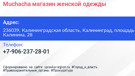 Muchacha, магазин женской одежды по адресу 236039, Калининградская область, Калининград, площадь Калинина, 28 в дальнейшем Организация, размещена в следующих категориях: