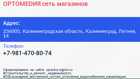 ОРТОМЕDИЯ, сеть магазинов по адресу 236005, Калининградская область, Калининград, Летняя, 14 в дальнейшем Организация, размещена в следующих категориях: