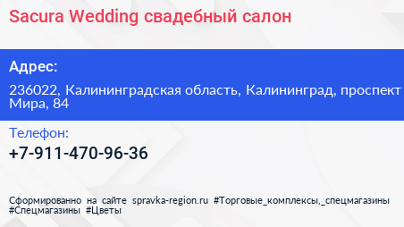 Sacura Wedding, свадебный салон по адресу 236022, Калининградская область, Калининград, проспект Мира, 84 в дальнейшем Организация, размещена в следующих категориях: