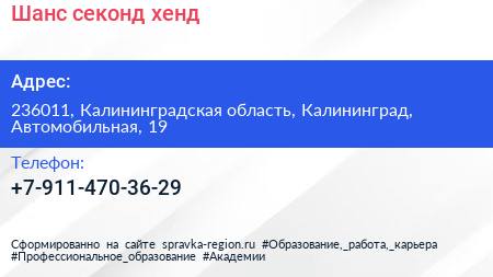 Шанс, секонд-хенд по адресу 236011, Калининградская область, Калининград, Автомобильная, 19 в дальнейшем Организация, размещена в следующих категориях: