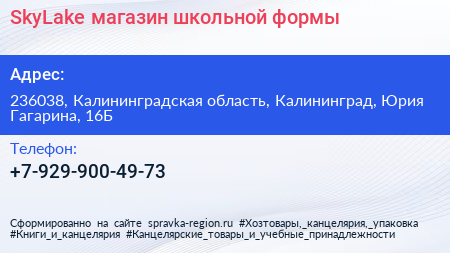 SkyLake, магазин школьной формы по адресу 236038, Калининградская область, Калининград, Юрия Гагарина, 16Б в дальнейшем Организация, размещена в следующих категориях: