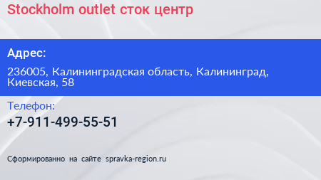 Stockholm outlet, сток-центр по адресу 236005, Калининградская область, Калининград, Киевская, 58 в дальнейшем Организация, размещена в следующих категориях: