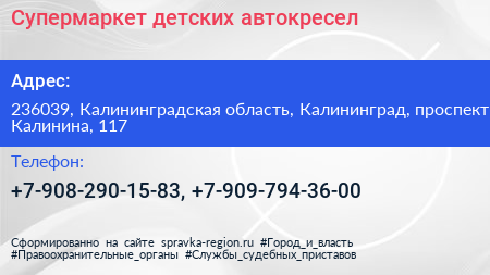 Супермаркет детских автокресел по адресу 236039, Калининградская область, Калининград, проспект Калинина, 117 в дальнейшем Организация, размещена в следующих категориях: