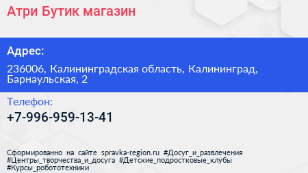 Атри-Бутик, магазин по адресу 236006, Калининградская область, Калининград, Барнаульская, 2 в дальнейшем Организация, размещена в следующих категориях: