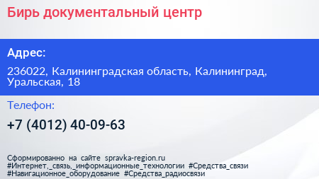 Бирь, документальный центр по адресу 236022, Калининградская область, Калининград, Уральская, 18 в дальнейшем Организация, размещена в следующих категориях: